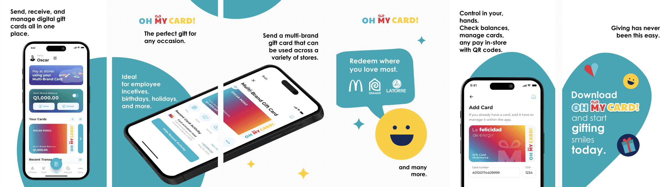 Simplifying an acquired gift card experience for the Guatemalan market. Oh My Card! is a digital gift card service available in Guatemala that allows users to purchase, send, and redeem prepaid value.